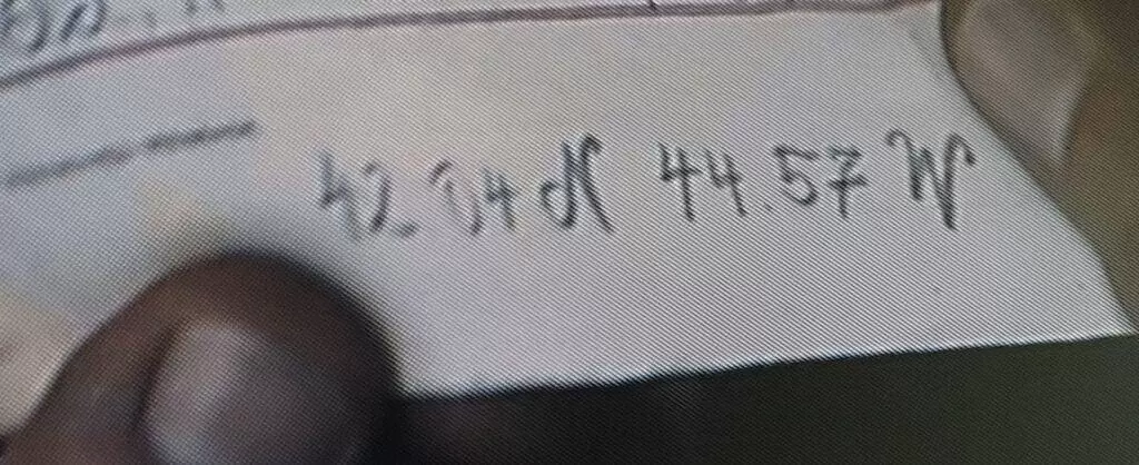 Mas a única coisa que a mensagem dizia (repetidamente) era: “42 04 N 44 57 W”, ou seja, coordenadas geográficas.