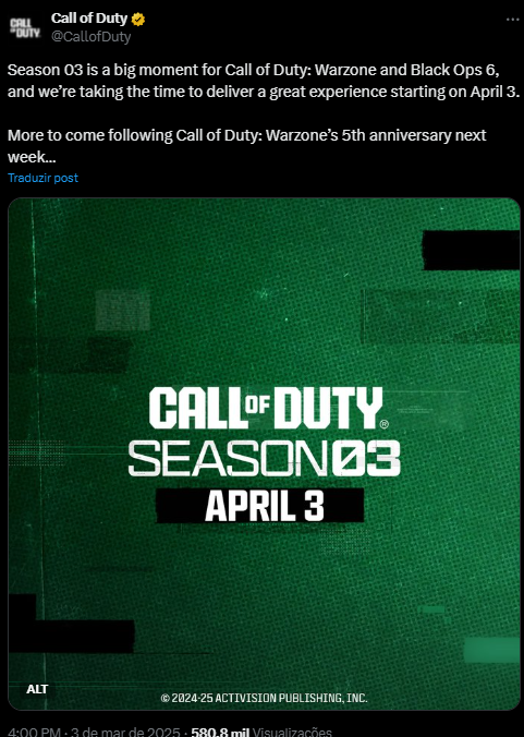 A nova season de Call of Duty: Black Ops 6 e Call of Duty: Warzone era esperada para ser lançada em algum momento deste mês, mas isso não será mais o caso. Hoje, a Activision anunciou que a SEASON 3 foi oficialmente adiada para 3 de abril. De acordo com um anúncio feito na conta oficial do Call of Duty no X/Twitter , os desenvolvedores estão “tomando um tempo para entregar uma ótima experiência”. Neste momento, mais detalhes não foram revelados.