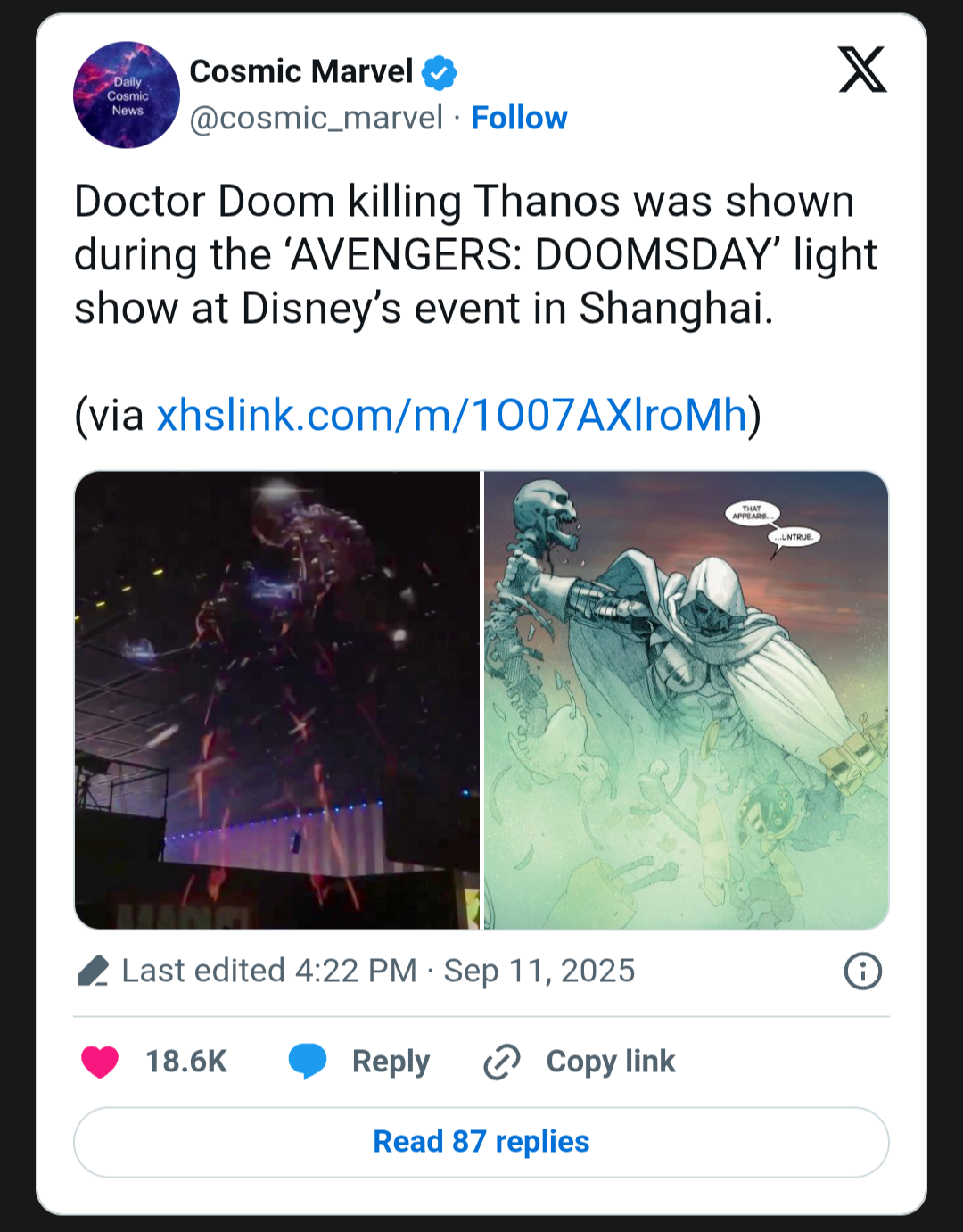 Na Exposição de Marketing oficial da Disney em Xangai, China, a Marvel Studios revelou um show de luzes de Vingadores: Doomsday, destacando a estreia completa de Robert Downey Jr. como Victor von Doom . Durante a maior parte do espetáculo, Doom foi a peça central, com sua armadura cômica brilhando no horizonte. Mas, após um minuto e quinze segundos de espetáculo, o público teve uma imagem chocante: Doom segurando um esqueleto na mão, exultando em triunfo, algo que já vimos antes.