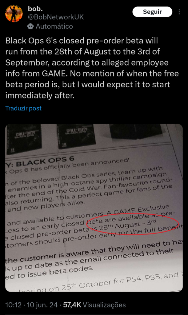 Os jogadores com uma assinatura ativa do Game Pass (Game Pass Ultimate, Game Pass PC ou Game Pass Console) também receberão acesso antecipado ao beta aberto do Black Ops 6. A Activision anunciou no domingo que Black Ops 6 será lançado em 25 de outubro de 2024 , para Xbox Series X/S, Xbox One, PS5, PS4 e PC.