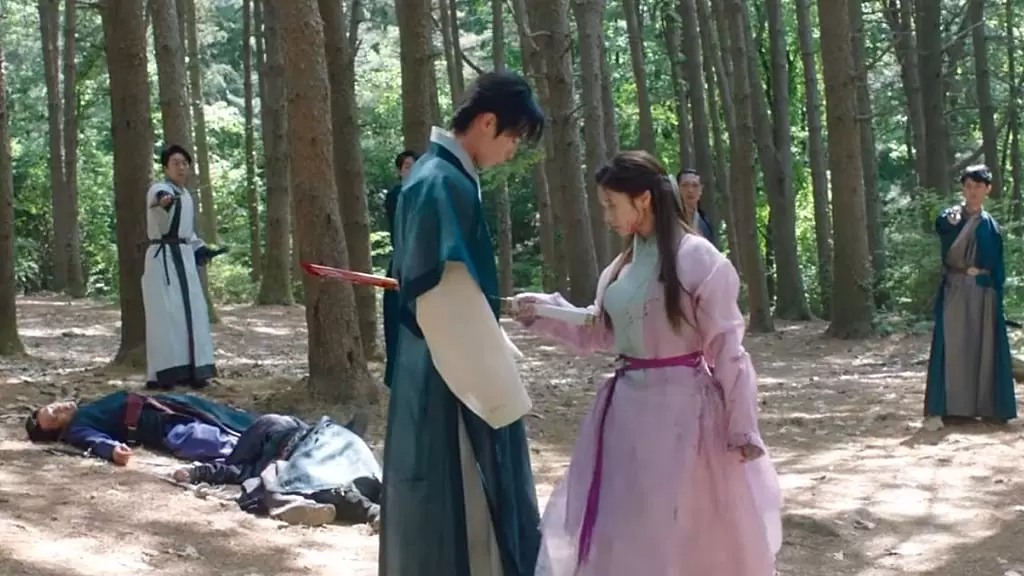 Jang Uk não vacila e continua sussurrando o nome de Mu Deok em seu ouvido. Mu Deok volta à consciência por um breve momento e percebe o que fez. Ela chora em desespero e tenta recuperar sua espada, mas Uk a abraça com força e deixa a espada passar por ele completamente.