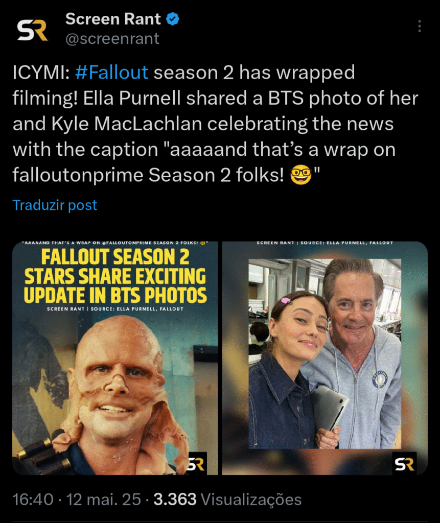 A segunda temporada de Fallout, adaptação da famosa franquia da Bethesda produzida pelo Prime Video, encerrou oficialmente suas filmagens. A informação foi divulgada por Ella Purnell, que interpreta Lucy MacLean, e por Walton Goggins, o Ghoul, por meio de postagens no Instagram e no perfil oficial da série no X.