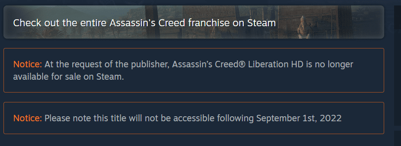 Este aviso foi postado na página do Steam de Assassin’s Creed Liberation HD, onde foi postado o seguinte: