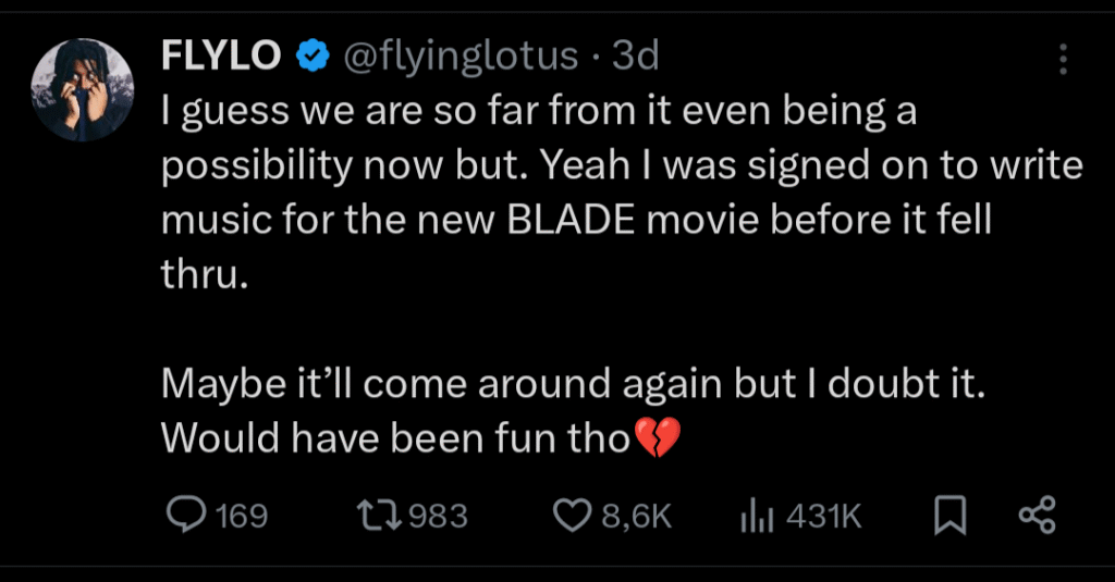 Na mais recente atualização sobre Blade, o artista Flying Lotus, responsável pela banda sonora do filme, publicou uma mensagem no X/Twitter onde disse que este dificilmente será lançado nos cinemas.