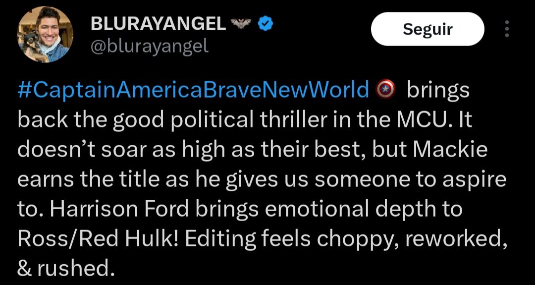 “#CaptainAmericaBraveNewWorld traz de volta o bom thriller político no MCU. Não voa tão alto quanto o melhor deles, mas Mackie ganha o título, pois nos dá alguém a quem aspirar. Harrison Ford traz profundidade emocional para Ross/Red Hulk! A edição parece irregular, retrabalhada e apressada.” – @blurayangel