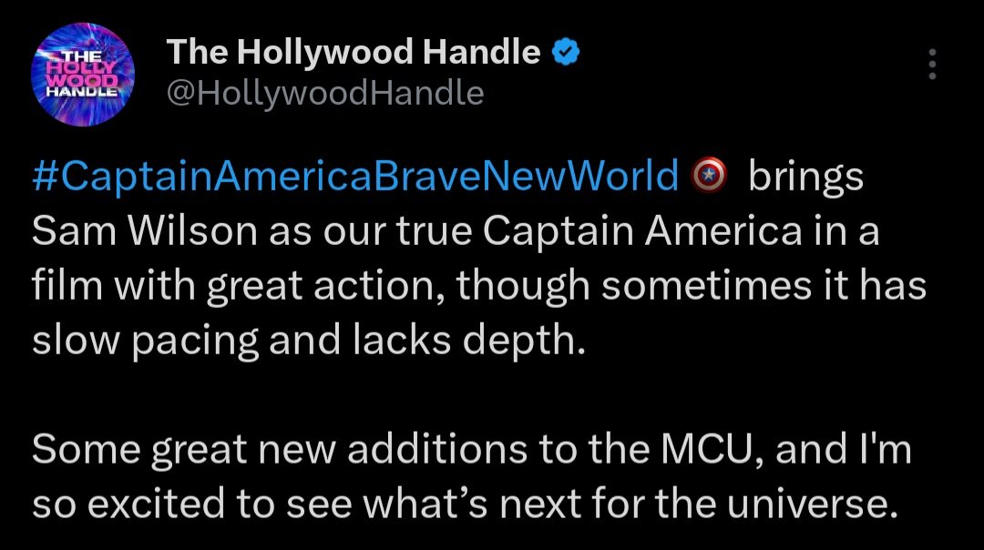 “#CaptainAmericaBraveNewWorld traz Sam Wilson como nosso verdadeiro Capitão América em um filme com muita ação, embora às vezes tenha um ritmo lento e falte profundidade. Algumas ótimas novas adições ao MCU, e estou muito animado para ver o que vem por aí para o universo” – @HollywoodHandle