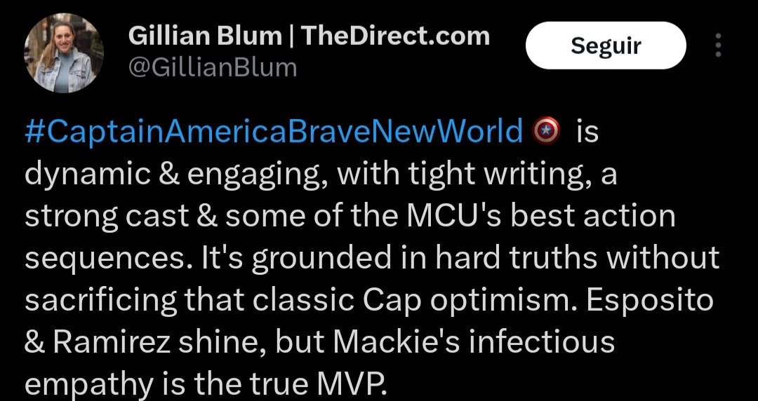 “#CaptainAmericaBraveNewWorld e dinâmico e envolvente, com escrita concisa. um elenco forte e algumas das melhores sequências de ação do MCU. É baseado em verdades duras sem sacrificar o otimismo clássico do Cap. Esposito e Ramirez brilham mas a empatia contagiante de Mackie é o verdadeiro MVP.” – @GillianBlum (The Direct)