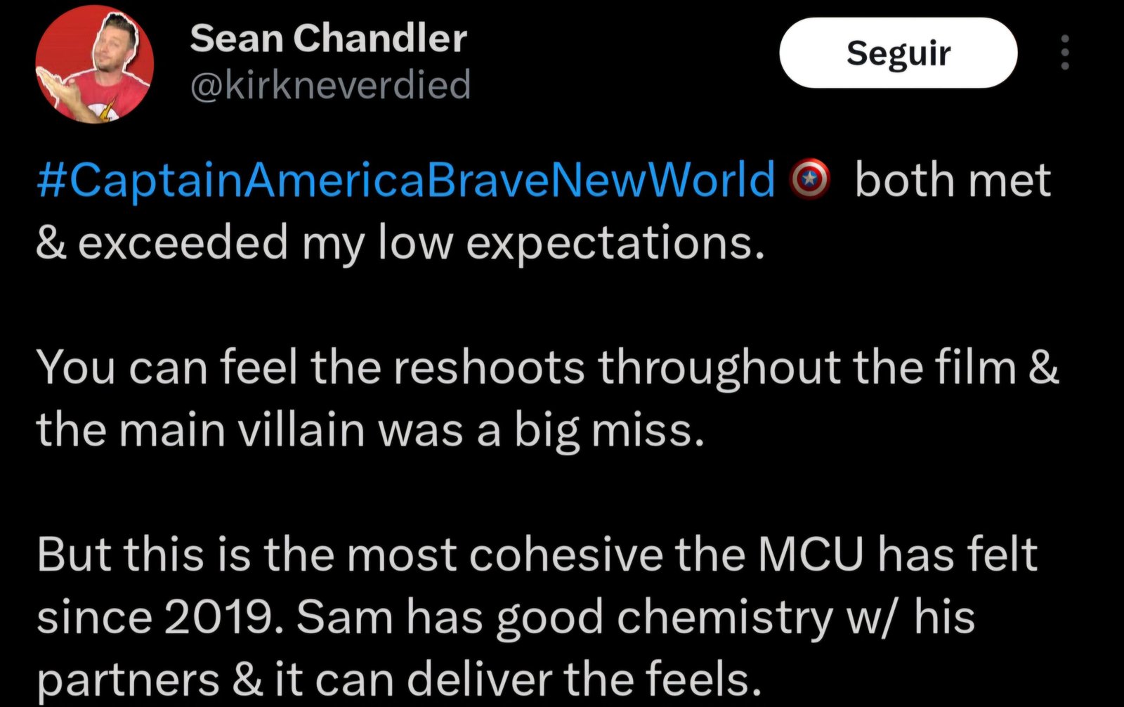 #CaptainAmericaBraveNewWorld ambos atenderam e superaram minhas baixas expectativas. Você pode sentir as refilmagens ao longo do filme e o vilão principal fez muita falta. Mas esta é a maior coesão que o MCU já sentiu desde 2019. Sam tem uma boa química com seus parceiros e isso pode transmitir as emoções. – @kirkneverdied