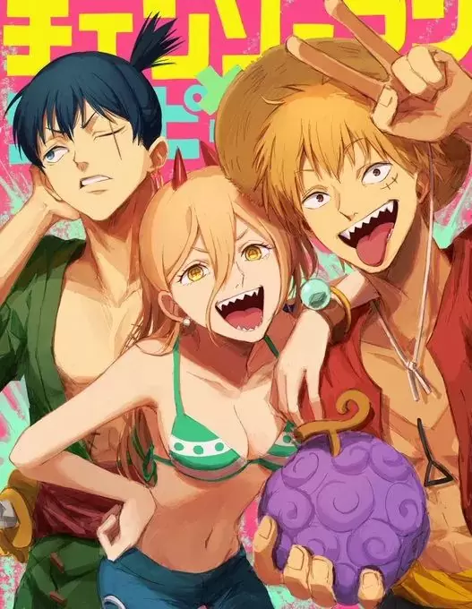 Tendo em vista o sucesso de um clássico anime/mangá ao mesmo tempo que um novo título torna-se ícone na atualidade, o artista “CHAKE” decidiu unificar os dois mundos em uma divertida ilustração. Na imagem, personagens de Chainsaw Man são inseridos no universo de One Piece. Denji aparece vestido como Luffy, ao lado de Power caracterizada como Nami, e Aki vestido de Zoro.