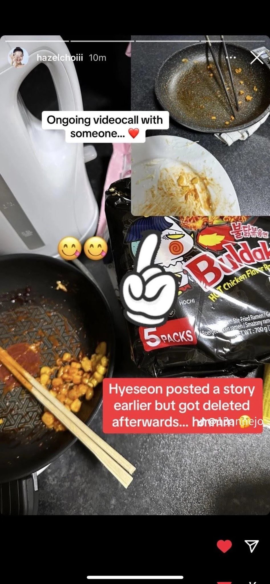 Anteriormente, um storys do instagram de Choi Hye-seon, foi excluído. Ela postou a foto de um prato sujo depois do ramen com o texto “videochamada em andamento com alguém”, incluindo um emoji de coração.