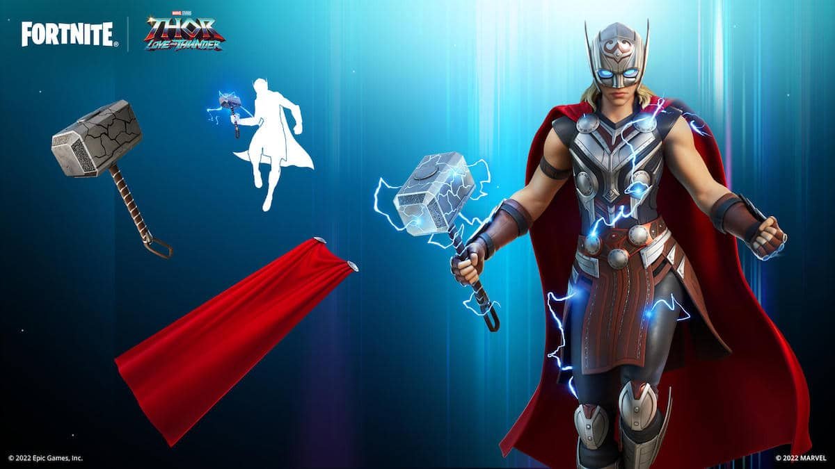 O pacote contém duas skins Love and Thunder para o Thor de Chris Hemsworth, bem como o Mighty Thor de Natalie Portman, com um visual semelhante ao do filme.