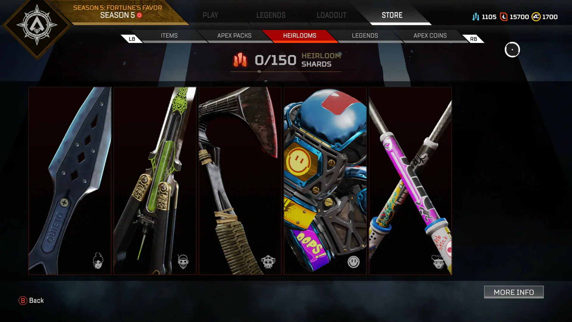 No momento, 12 personagens de Apex Legends têm suas próprias armas corpo a corpo Heirloom, com as lendas restantes provavelmente as receberão no futuro.As 12 lendas são: