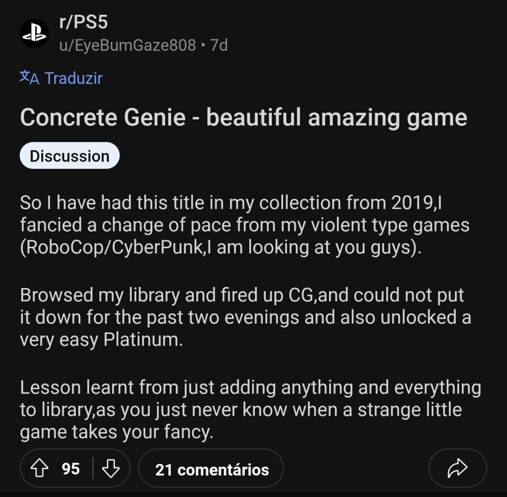 A postagem dizia que o jogo Concrete Genie é “lindo e incrível”. A postagem dizia ao mesmo jogador que ele comprou o jogo em 2019 para mudar o ritmo de seus jogos de luta, e recentemente ele navegou em sua biblioteca cheia de jogos e encontrou Concrete Genie. Ele disse que não conseguia largar o jogo e que adorou, assim como os comentários no post que disseram que adoraram o jogo.