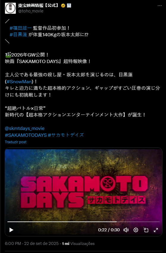 A Toho Pictures confirmou a notícia que os fãs aguardavam ansiosamente: o universo de Sakamoto Days será expandido com uma aguardada adaptação em live-action. E, para a surpresa de todos, o estúdio anunciou que a saga do ex-assassino mais temido do mundo será contada em um épico de duas partes, com previsão de estreia para a Golden Week de 2026 nos cinemas japoneses.