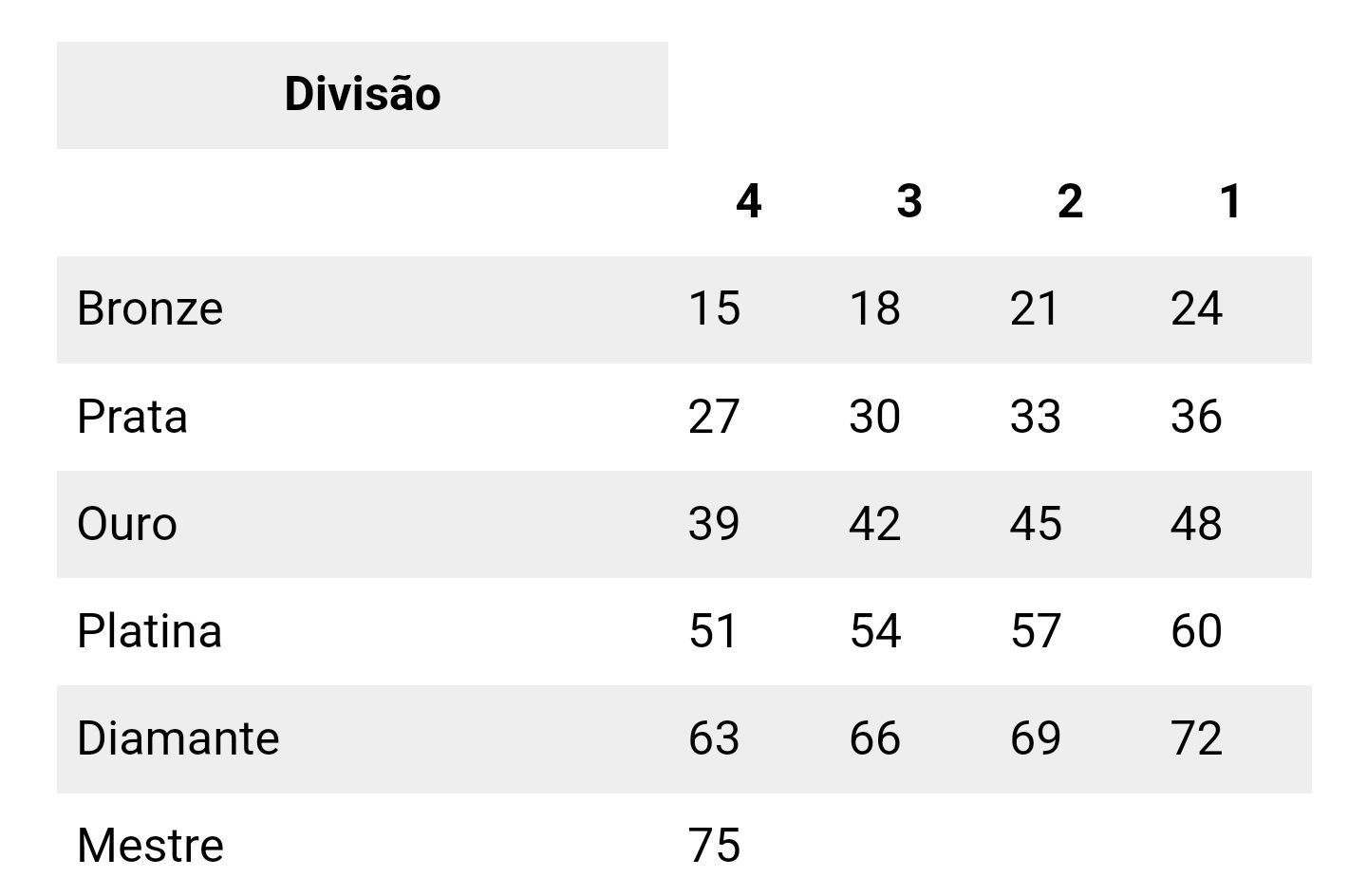 Assim, por exemplo, um jogador da Divisão 4 da Platina terá um custo de entrada de 51. Para jogadores da Divisão 1 da Platina, eles terão um custo de entrada de 60. Há um aumento de três RP cada vez que você aumenta sua divisão dentro de uma classificação .