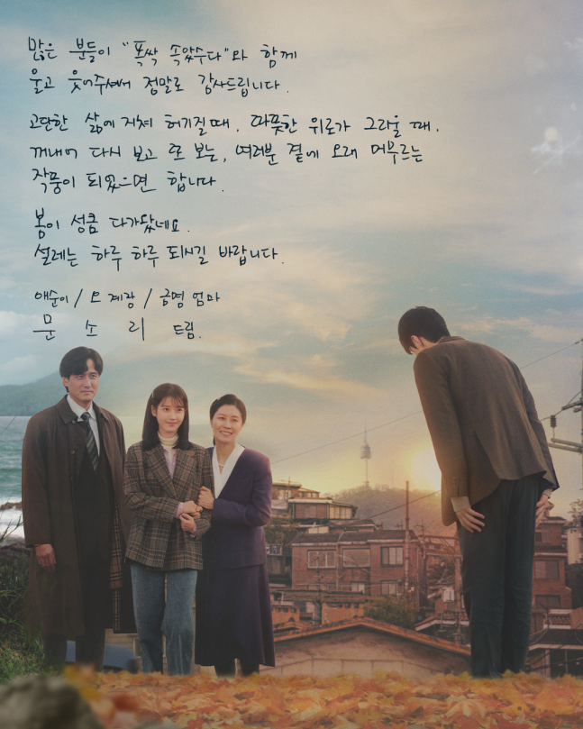 IU, que interpretou duas gerações — a jovem Ae-soon e sua filha Geum Myeong — agradeceu aos espectadores por acompanharem a jornada dos personagens, desejando que o drama permaneça como um “chá quente de tangerina” que aquece por muito tempo.