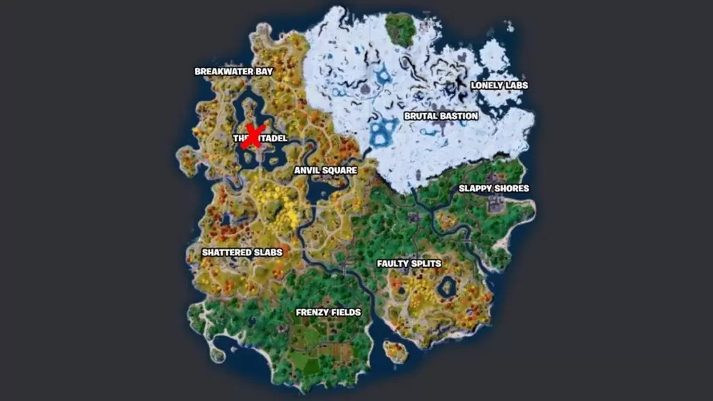 Este chefe pode ser encontrado na Cidadela no lado oeste do mapa Fortnite. Dirija-se a este POI depois de entrar no Fortnite e você o encontrará no centro. Você pode ver este local no mapa, cortesia de Fortnite.GG .Essa luta de chefe não será fácil, então recomendamos ir até lá com uma equipe para ajudá-lo na luta. No entanto, apenas um de vocês será capaz de coletar o Ex-Calibur Rifle do Ageless Champion quando ele o deixar cair.
