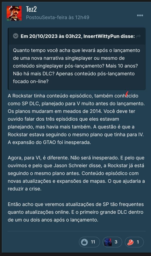 “A questão é: a Rockstar estava seguindo com um plano parecido ao que tinham para IV. O ‘boom’ do Online foi inesperado. Agora, para GTA 6, é diferente. Não será inesperado. E pelo que ouvimos, a Rockstar quer conteúdo episódico com novidades e expansões de mapas. O que ajudaria a reduzir a crise. Então, acho que vamos ver atualizações de singleplayer tão frequentes quanto atualizações online. A primeira grande expansão deve chegar dentro de um ou dois anos do lançamento.”