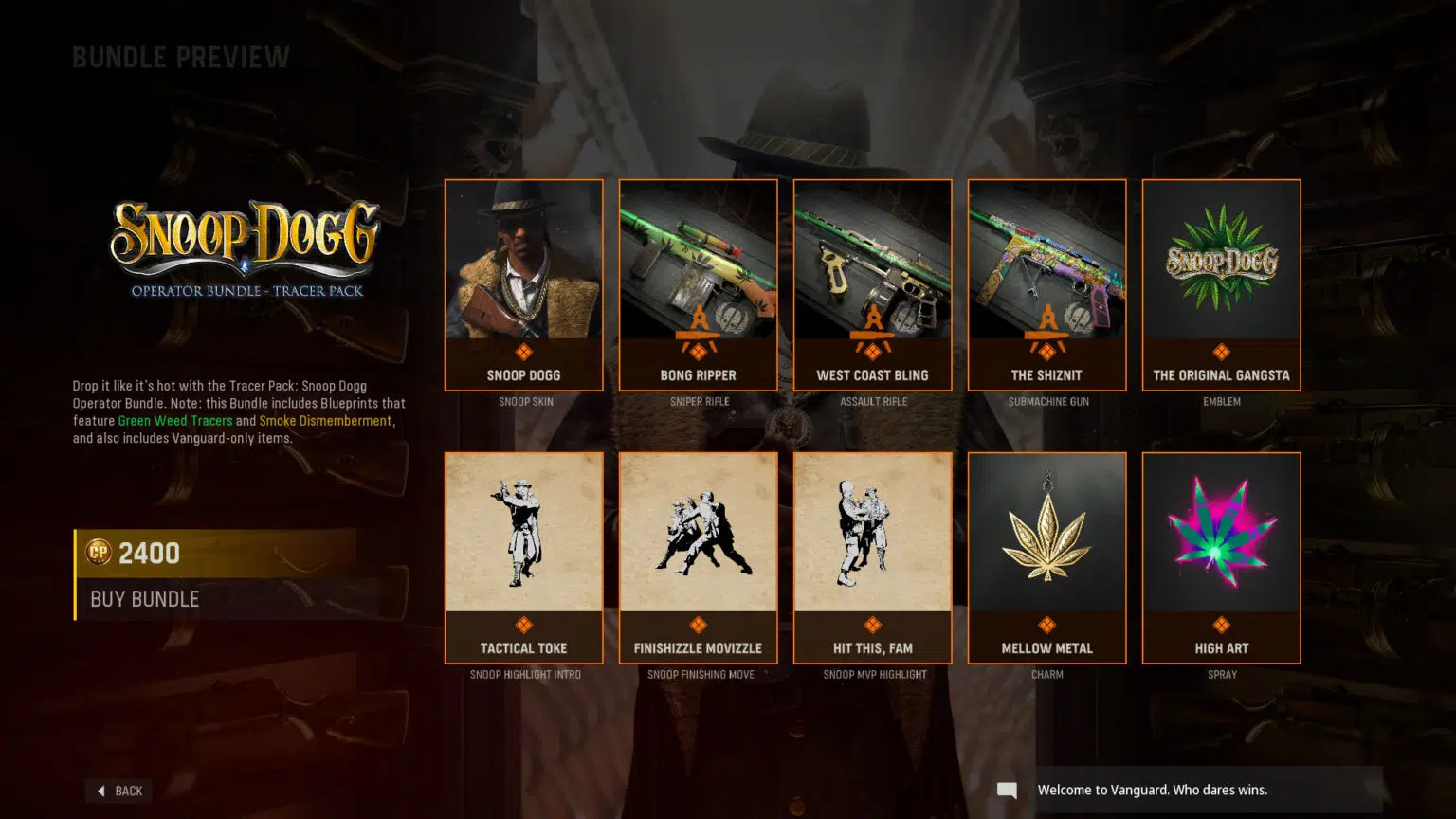 A versão Warzone e Vanguard do pacote Snoop Dogg Operador incluirá uma trilha completa de progressão do Operador e dez itens, três dos quais são exclusivos da Vanguard.