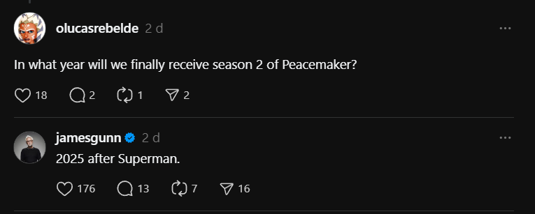 Em uma postagem recente no Threads, o coCEO da DC Studios, James Gunn, revelou que a segunda temporada de Peacemaker será lançada em “2025, depois do Superman “.