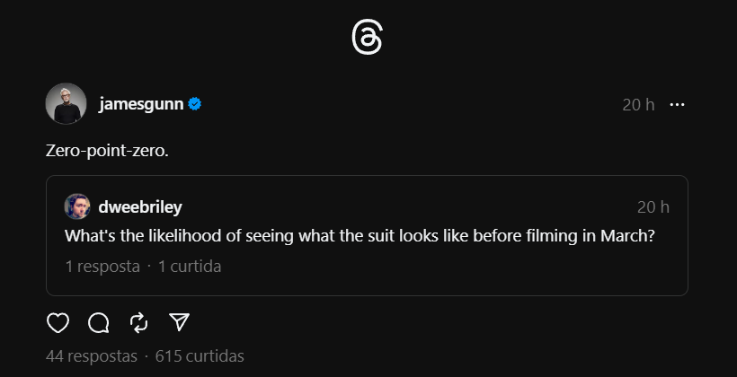 Quando questionado por um fã sobre quais são as chances de um fã ver uma fantasia, Gunn disse que as chances são de “zero vírgula zero”, descartando qualquer noção de que uma revelação de fantasia aconteceria entre agora e março próximo.
