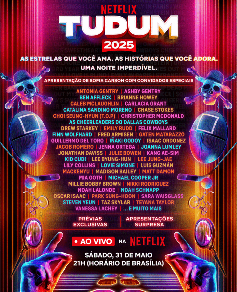 Durante o TUDUM, a Netflix promete apresentar trailers, prévias exclusivas e anúncios inéditos sobre suas produções mais aguardadas.
