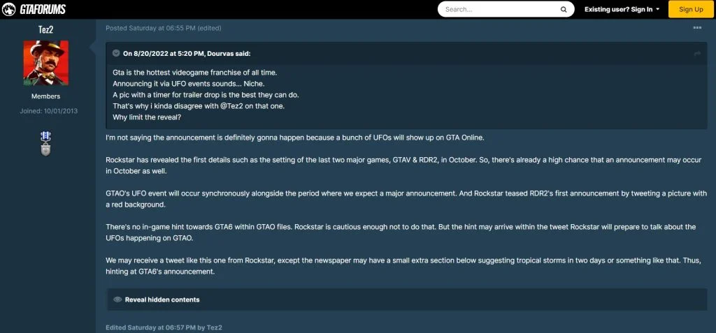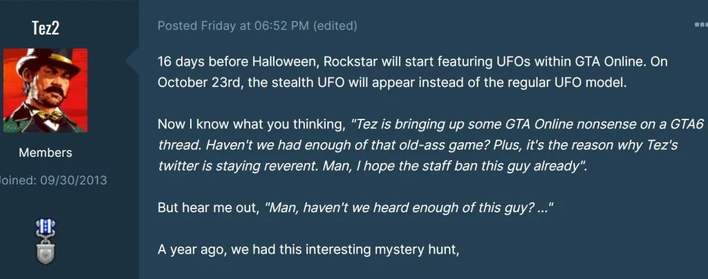 A foto chamou a atenção da comunidade de Grand Theft Auto porque os jogadores não conseguiam identificar a casa de nenhum título da Rockstar, e havia um OVNI voando atrás dela. Tez afirma que isso pode ser relevante para GTA 6.Ele acrescentou em outro comentário no tópico que há uma “grande chance” de que a Rockstar Games esteja planejando um anúncio oficial do GTA 6, que acontecerá no momento do evento GTA Online Halloween.Tez 2 explicou: “Não há nenhuma dica no jogo para o GTA 6 nos arquivos do GTA Online. A Rockstar é cautelosa o suficiente para não fazer isso. Mas a dica pode chegar no tweet que a Rockstar se preparará para falar sobre os OVNIs acontecendo no GTA Online.”