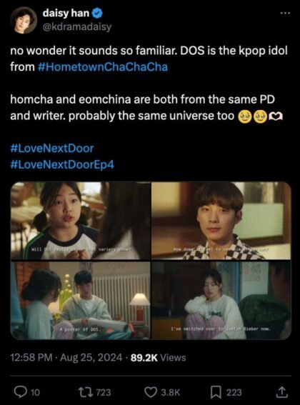 Outra referência que uma pessoa notou, foi que Hye-jin, de “Hometown Cha-Cha-Cha”, abriu uma clínica odontológica em Homcha, enquanto Seung-hyo de “Love Next Door”, inaugurou um novo escritório de arquitetura. Além disso, elas têm o mesmo ator Jo Han-chul, que interpretou o pai de dois personagens principais.