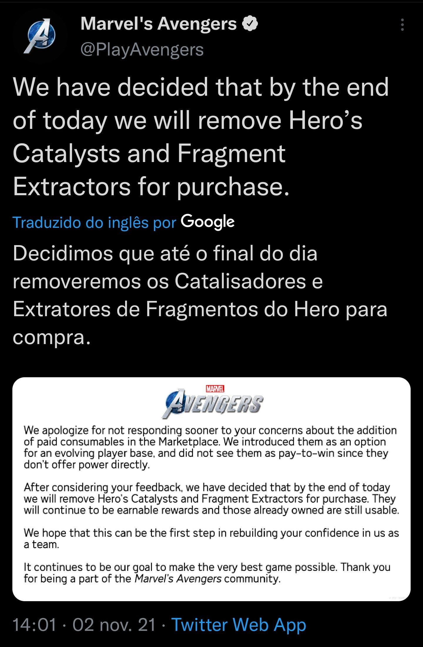 “Depois de considerar seus comentários, decidimos que até o final de hoje removeremos os Catalisadores e Extratores de Fragmento Hero’s para compra. Eles continuarão a ser recompensas merecedoras e aqueles já ganhos ainda podem ser usados.”