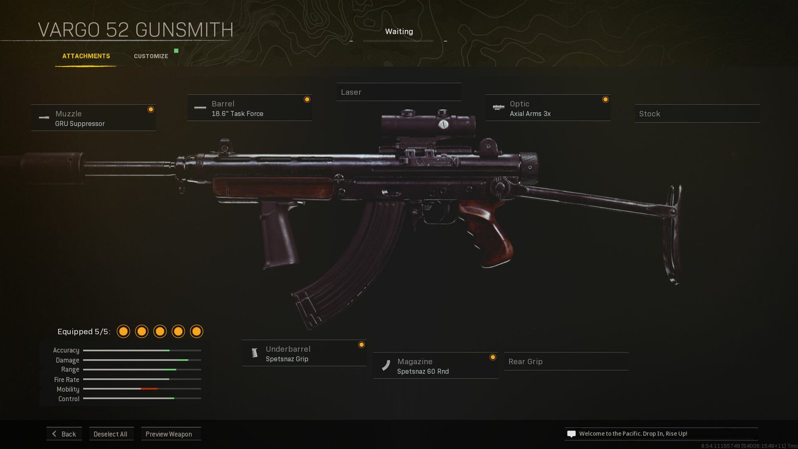 Como o Vargo 52 é uma arma da Black Ops Cold War, podemos usar a construção típica de Warzone para rifles de assalto da Guerra Fria. O GRU Suppressor e o cano Task Force de 18,6 ″ combinados melhoram muito o alcance do Vargo, tornando-o incrivelmente poderoso e preciso à distância.