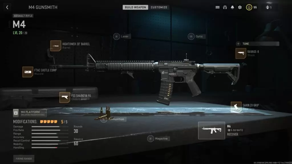 Primeiro, equipamos o FTAC Castle Comp Muzzle que ajuda no controle de recuo horizontal e vertical do M4, mantendo a arma em distâncias maiores. Então, o Tempus Hightower 20 ″ Barrel é a chave para essa construção, pois aprimora a velocidade da bala, o alcance, a precisão do tiro no quadril e o controle de recuo, tudo em um, tornando o M4 forte em quase todas as situações.