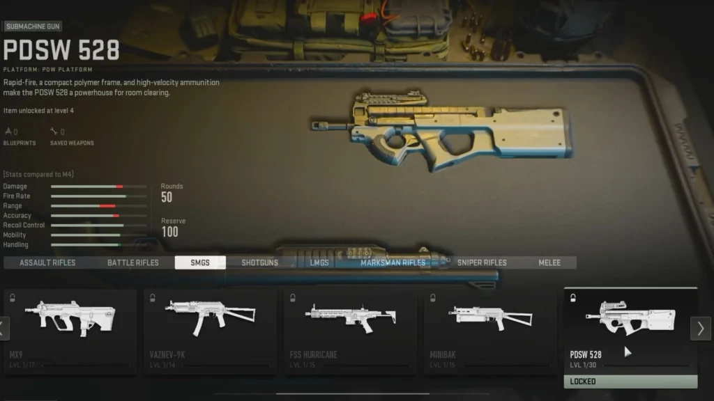 Além do Rifle de Assalto M4 , o jogo também traz outra arma básica do Modern Warfare para a batalha, o P-90 SMG, que agora é conhecido como PDSW 528.