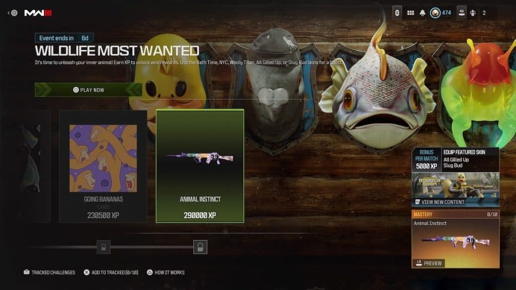 Para desbloquear o Projeto Kastov 762 Animal Instinct, você deve acumular 290.000 XP durante o evento e completar o desafio final Wildlife Most Wanted.