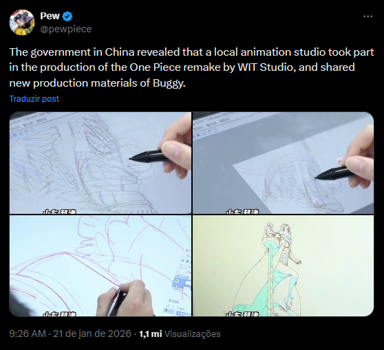 Nas imagens, aparecem materiais de produção ligados ao remake oficial de One Piece, já confirmado publicamente. Também surgem referências visuais a Demon Slayer.