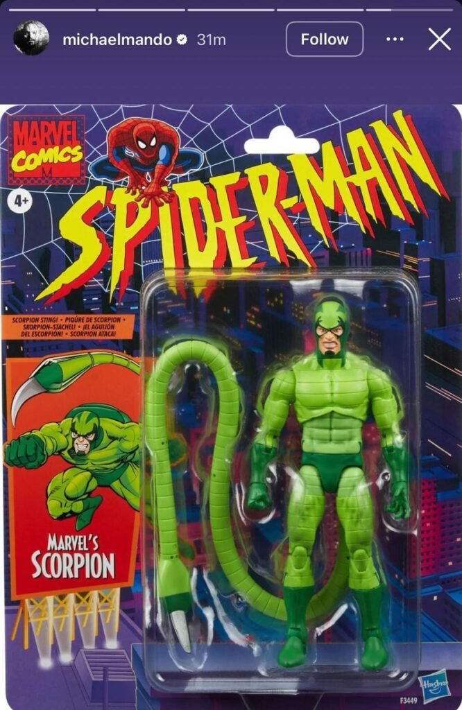 As expectativas aumentaram após Mando compartilhar nos stories do Instagram uma imagem de um boneco clássico do Escorpião com o traje completo de supervilão. A publicação, que foi preservada pela página Cosmic Marvel no X (antigo Twitter), fez crescer a crença de que o uniforme verde fará parte do visual do personagem em Homem-Aranha 4.