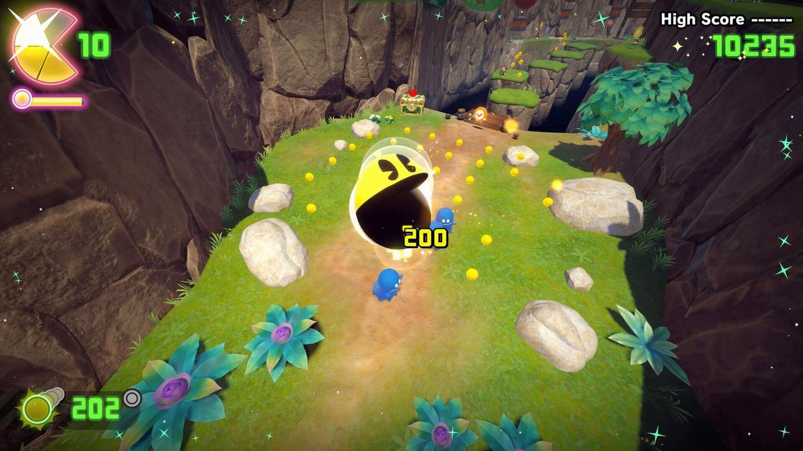 Um problema comum em jogos de plataforma 3D daquela época era a dificuldade em julgar saltos, levando a momentos frustrantes. A Bandai Namco resolve isso com a adição engenhosa de um marcador de sombra que indica exatamente onde Pac-Man irá pousar. É um recurso simples e discreto que melhora drasticamente o fluxo do jogo, permitindo que os jogadores desfrutem do charme e da jogabilidade sem se prenderem a mecânicas desajeitadas.