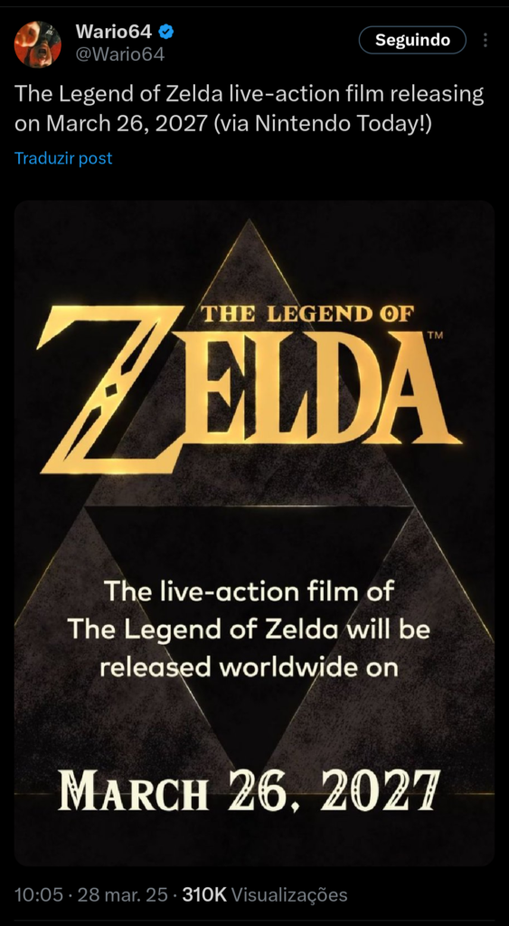 Hoje no aplicativo Nintendo Today!, ele revelou algumas grandes novidades sobre seu próximo longa-metragem. Uma das franquias mais populares da Nintendo é The Legend of Zelda, a série de ação e aventura dos criadores Shigeru Miyamoto e Takashi Tezuka. É uma das séries de videogame mais elogiadas pela crítica de todos os tempos, tornando-a aparentemente digna de uma adaptação live-action. Jogos como Ocarina of Time, A Link to the Past e Breath of the Wild não são apenas amados por fãs e críticos, mas influenciaram muitos jogos depois dele. A magia desses títulos será adaptada para um filme live-action, que deve chegar aos cinemas em 26 de março de 2027, conforme anunciado no aplicativo Nintendo Today! (conforme compartilhado por Wario64 no X )