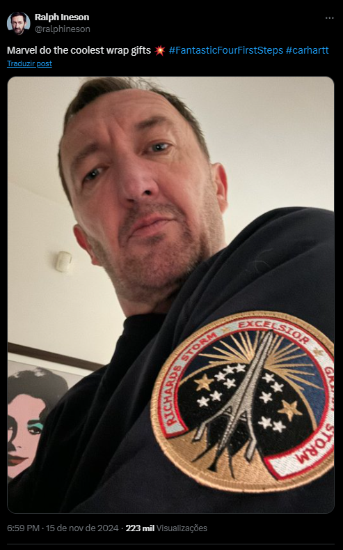 No Twitter, o astro Ralph Ineson (que interpreta Galactus no filme) compartilhou uma foto sua exibindo seu estilo: uma camisa ostentando um decalque extravagante de uma nave espacial decolando entre as estrelas. Ao redor da imagem, os nomes dos membros da equipe do Quarteto Fantástico estão escritos ao lado da palavra “excelsior”, que era o famoso bordão de Lee.