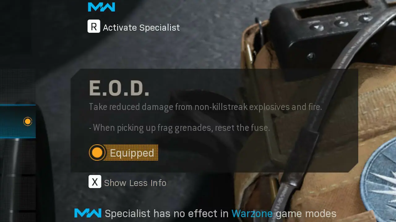 Muito parecido com Flak Jacket, EOD está focado em proteger o jogador de explosivos recebidos. Não apenas reduz o dano de Semtex e Claymores, mas também reinicia o fuse nas granadas devolvidas, removendo parte do risco.