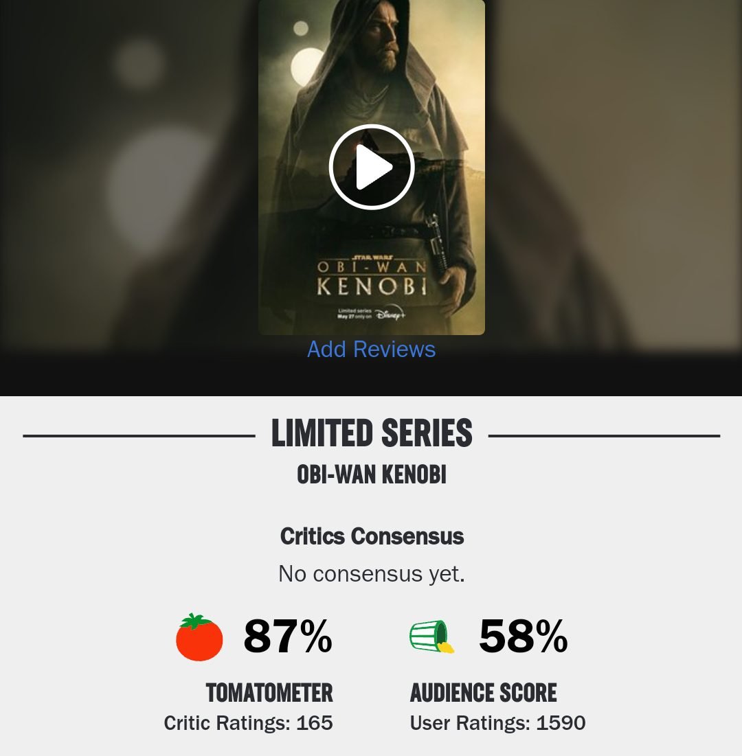 Com mais 3 episódios ainda para serem lançados e finalizar a história, a série já recebe críticas e elogios. No Rotten Tomatoes, Obi-Wan Kenobi conta com uma aprovação de 87% entre os críticos, mas é a nota dos fans que chamam atenção.