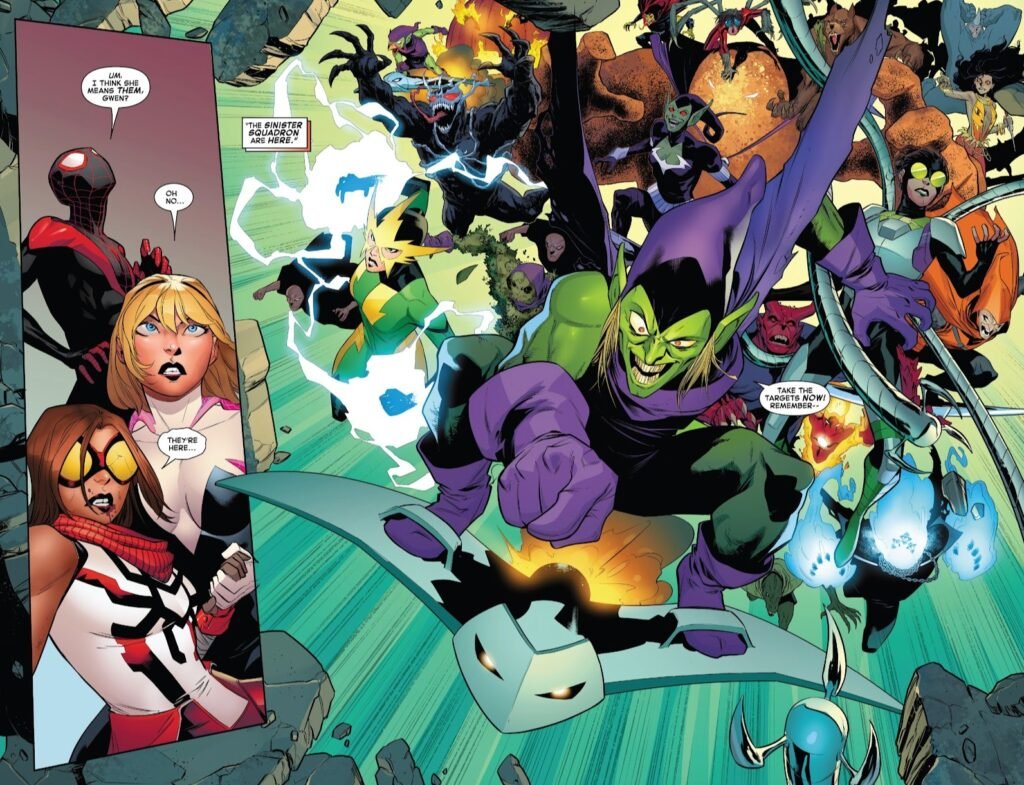 Depois que Gwen Goblin lidera um ataque ao QG da Sociedade-Aranha e derrota sua contraparte Gwen Stacy da Terra-65, também conhecida como Aranha-Fantasma, que recentemente se mudou permanentemente para a Terra-616 o Esquadrão Sinistro é revelado como composto por vilões do Homem-Aranha de todo o Aranhaverso. Vilões do Universo Marvel principal incluindo Francine Frye Electro e a Carolyn Trainer Doutora Octopus uniram forças com variantes de vilões como o vilão da Garota-Aranha Fury, a Rainha Goblin (Terra-982), o vilão Porco-Aranha Green Gobbler (Terra-8311) e Venom 2099, e versões do universo alternativo dos vilões clássicos Scorpion, Mysterio, Hobgoblin, Rhino, o Lagarto, Calypso, Swarm, Tarântula e Mud-Thing (um Sandman e Hydro-Man combinados).