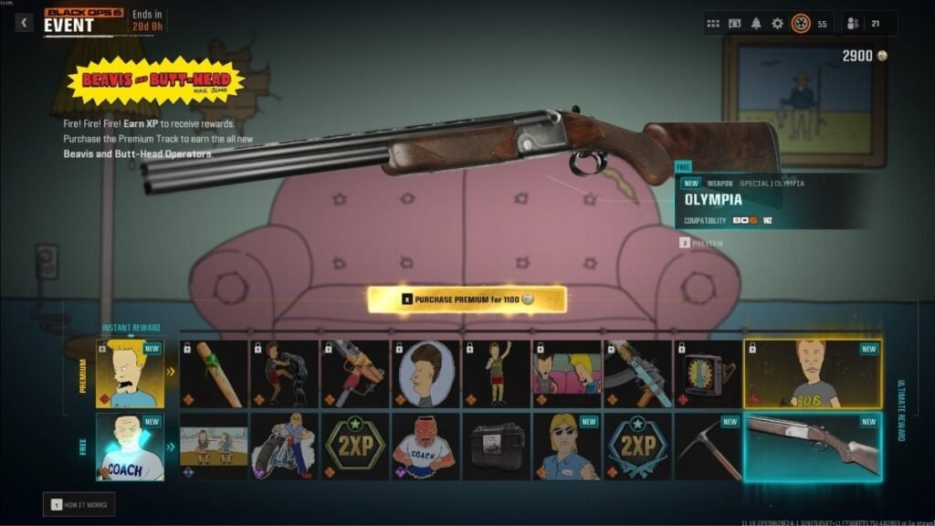 A Olympia é uma das recompensas gratuitas no novo evento temático Beavis e Butthead. Com 10 itens desbloqueáveis no nível grátis e outros 10 no premium, a espingarda aparece como a décima recompensa da trilha gratuita. Para conquistá-la, basta acumular XP, completar desafios e avançar nas etapas do evento.