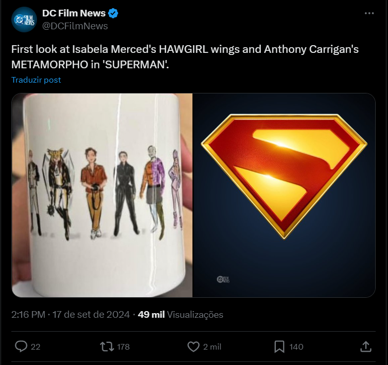 Compartilhado por @DCFilmNews no X (antigo Twitter), o copo apresenta vários personagens do próximo filme, mas especificamente dá aos fãs a primeira visão completa do traje de Mulher-Gavião com asas de Isabela Merced.