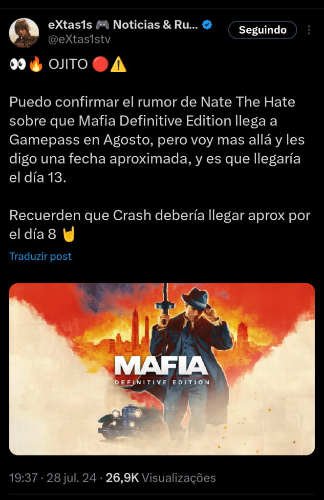 “Posso confirmar o rumor de Nate The Hate de que Mafia Definitive Edition chega ao Gamepass em agosto, mas vou além e digo uma data aproximada, que chegará no dia 13.”