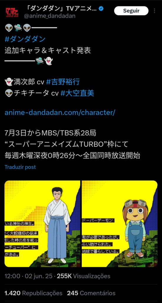 O estúdio Science Saru está se preparando para o lançamento da segunda temporada de Dandadan, trazendo novas artes promocionais e atualizações sobre o elenco. A conta oficial da série no X (antigo Twitter) divulgou folhas de design inéditas dos personagens Manjiro e Chiquitita.