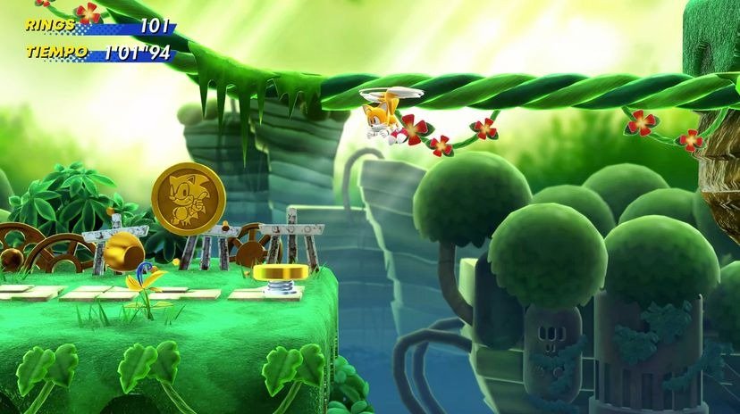 Nosso número de anéis está diminuindo, então temos que empurrar rapidamente e na direção certa, para chegar o mais próximo possível de uma Esmeralda que está se afastando de nós. Não é a fase “Esmeralda” mais espetacular da série, mas certamente representa um desafio importante. Cada vez que conseguimos uma Esmeralda, desbloqueamos um novo poder, que pode ser executado com qualquer personagem e que lembra os fogos-fátuos de Sonic Colors. Assim, por exemplo, permite-nos sair da água e subir cachoeiras. Outro gera um cipó para subir e chegar a lugares inacessíveis. Depois de desbloquear o poder, o jogo nos notifica com um ícone se estivermos em um ponto do mapa onde é conveniente usá-lo.