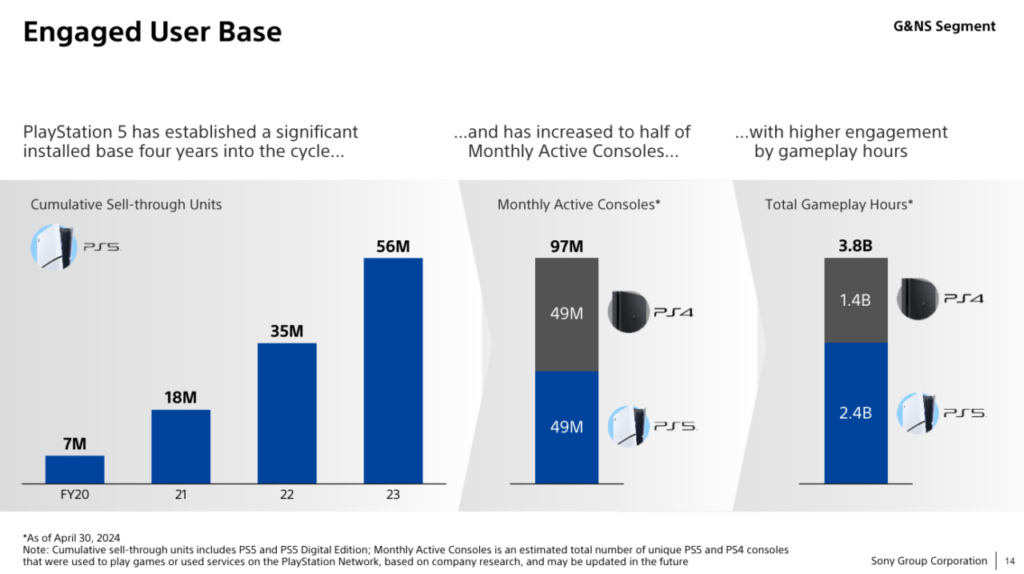 Atualmente, o número de consoles PS5 vendidos (59,3 milhões) está praticamente em linha com o nível do PlayStation 4 durante o mesmo período de sua vida (60 milhões).