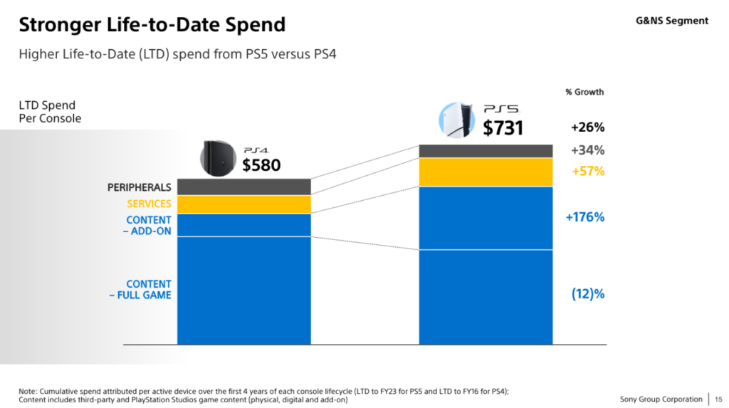 De acordo com a SIE, os usuários do PS5 estão gastando mais dinheiro e mais tempo jogando do que no PS4. Os usuários do PS5 estão gastando, por console, mais em conteúdo adicional (+176%), serviços (+57%) e periféricos (+34%), mas 12% menos em jogos completos, segundo a Sony.
