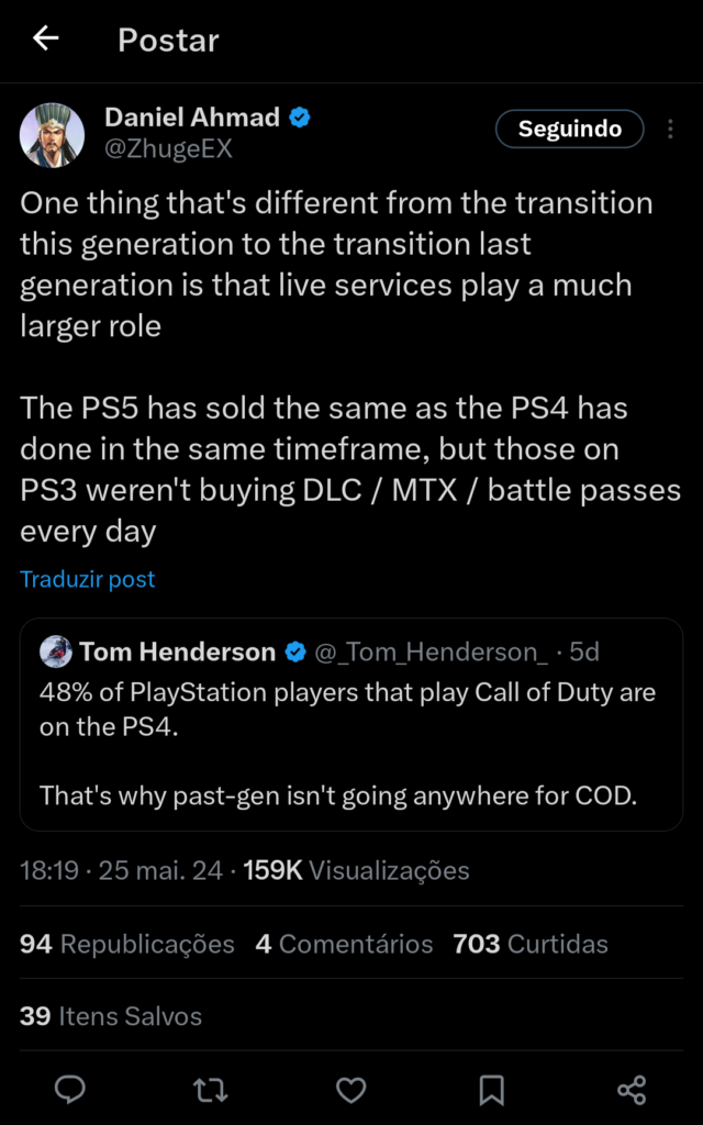 “O PS5 vendeu o mesmo que o PS4 no mesmo período, mas aqueles no PS3 não compravam DLC/MTX/passes de batalha todos os dias.”