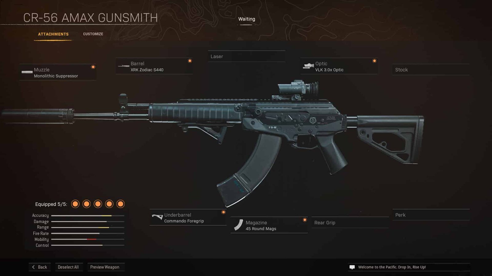 Começaremos nosso Warzone CR-56 AMAX equipando o cano Supressor Monolítico e o cano XRK Zodiac S440 para melhorar seu alcance de dano efetivo, tornando-o ideal para combate de médio alcance.